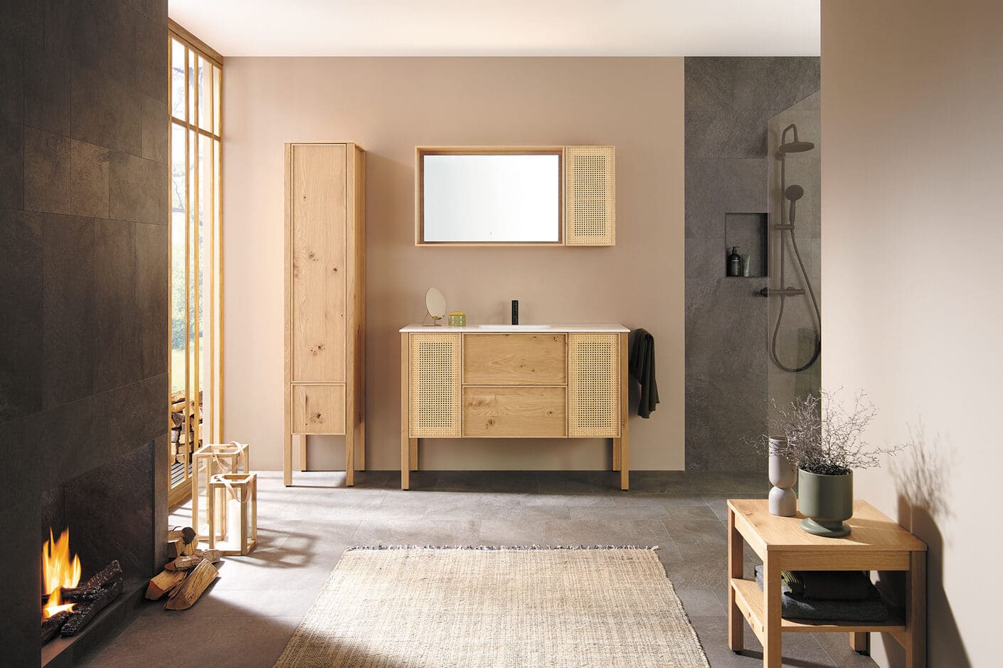Les meubles salle de bain sont posés sur quatre pieds d’angle en bois massif qui forment la structure de base de tous les meubles. Un système de grille permet d’adapter parfaitement tous les éléments : les miroirs et les armoires latérales, les meubles bas pour plan de toilette et les armoires hautes.