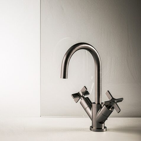 Dans cette collection, la réduction du diamètre du bec a permis de créer un robinet aux lignes élégantes et minimalistes. Les poignées présentent des croisillons à ailettes plates pour plus de modernité.