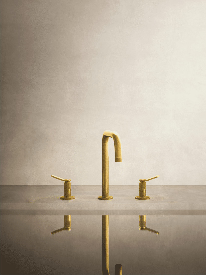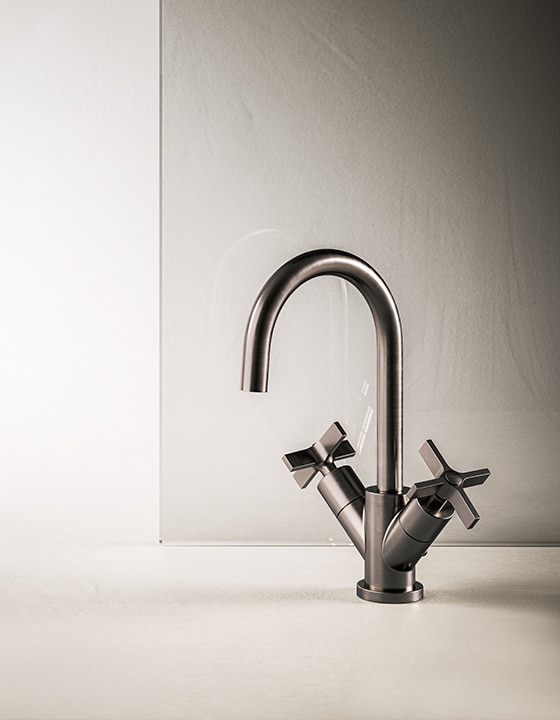 Dans cette collection, la réduction du diamètre du bec a permis de créer un robinet aux lignes élégantes et minimalistes. Les poignées présentent des croisillons à ailettes plates pour plus de modernité.