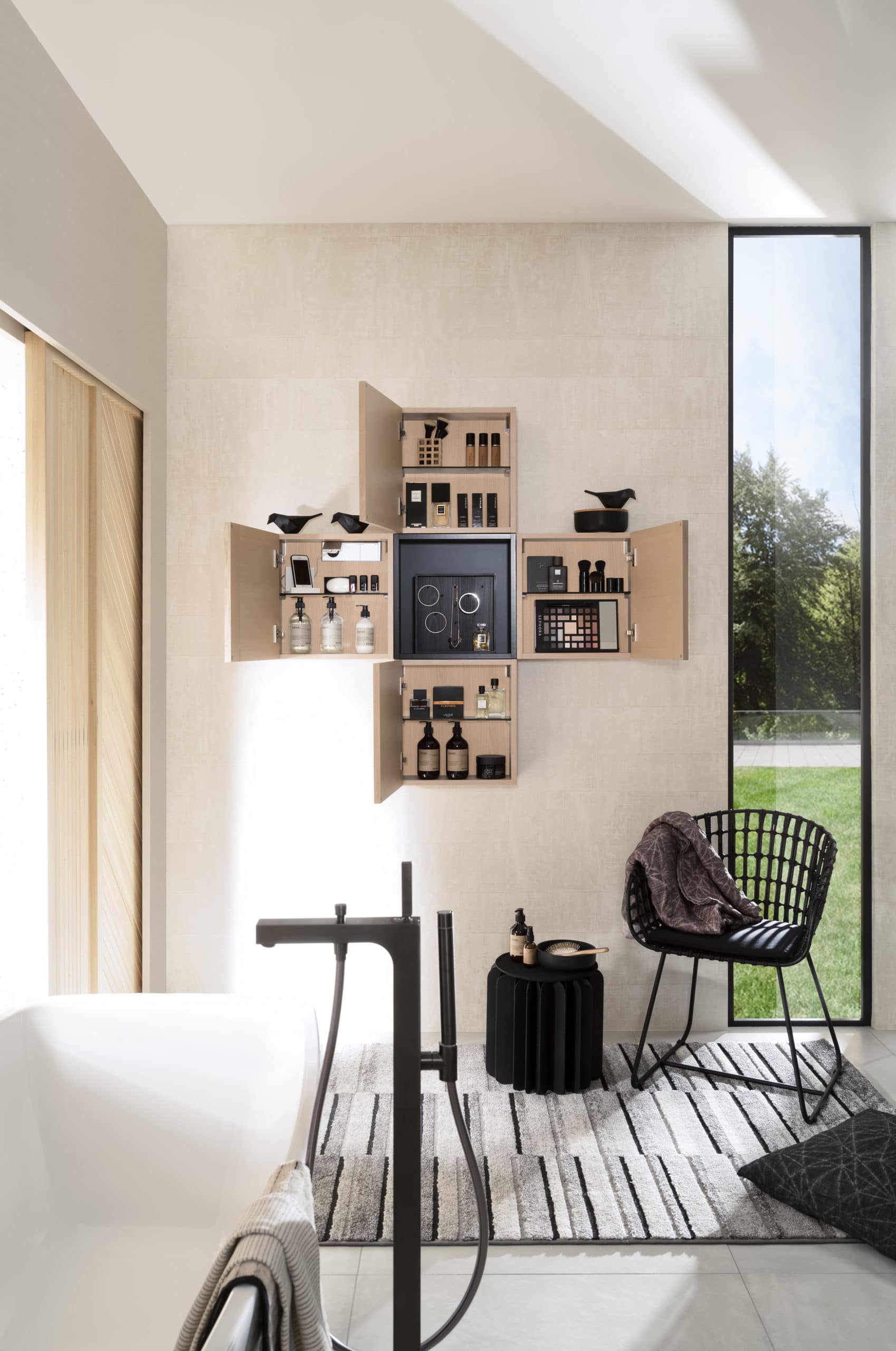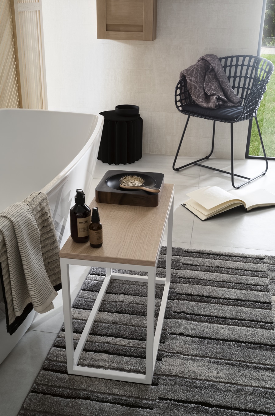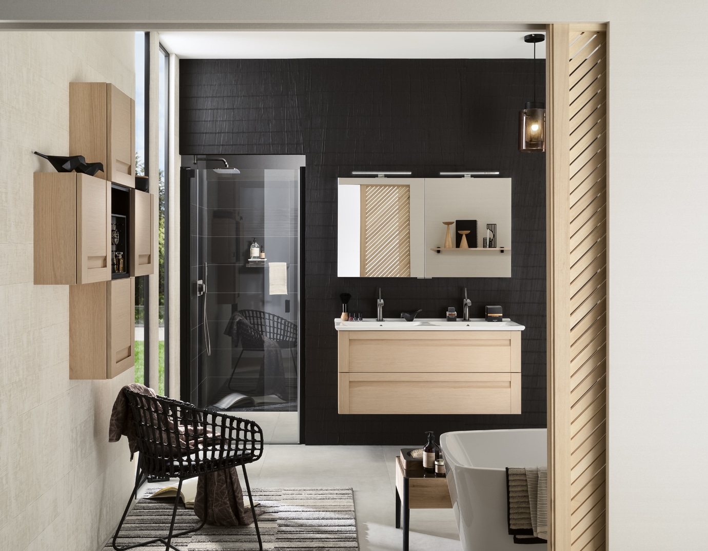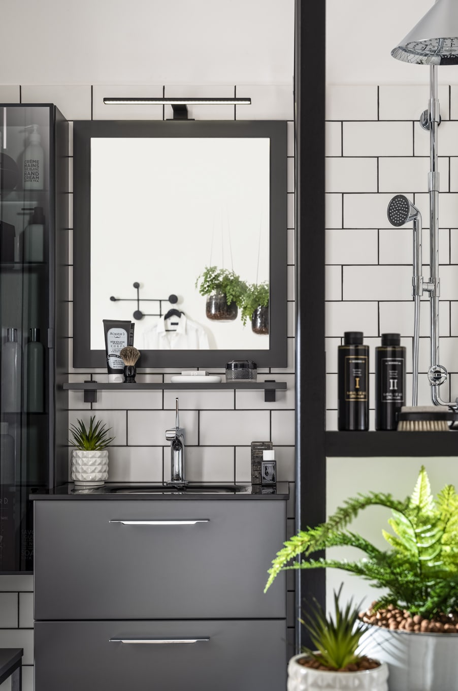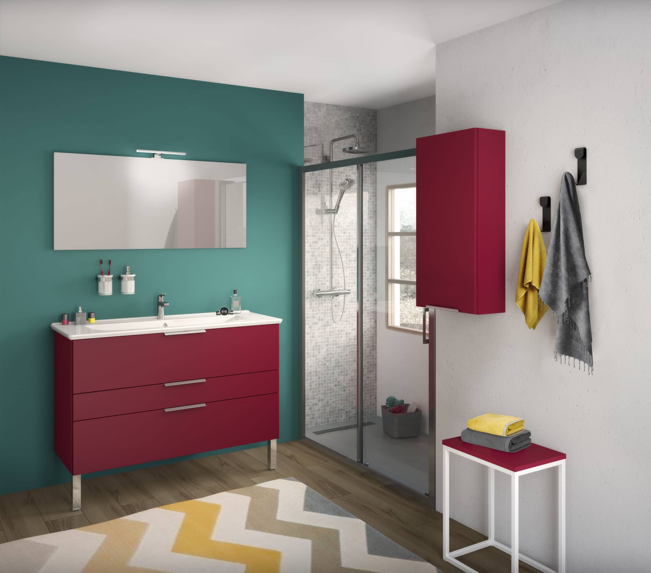Ensemble salle de bain adapté aux petits espaces contenant un meuble vasque de 60 cm accompagné d’une colonne vitrine de 124 cm de hauteur. La colonne salle de bain permet de donner de la verticale à la composition tout en proposant des rangements et un miroir en option. Fermée, elle crée un léger reflet pour éclaircir l’espace.