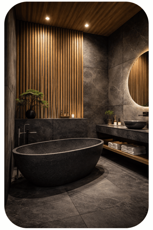 Le carrelage et la baignoire noire rappellent la couleur de la pierre volcanique très présente au Japon (lieu de naissance de la philosophie Zen). Les lames de bois verticales ont elles un air de tiges de bambous.