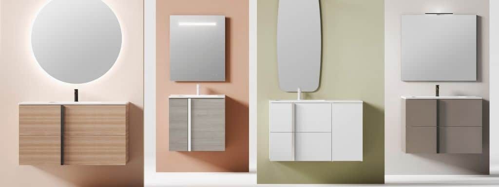 Anconetti propose dans sa nouvelle collection 2021/2022 des meubles design plus colorés. Ici le miroir avec rangement et le meuble sous vasque sont tous deux recouverts de jaune.