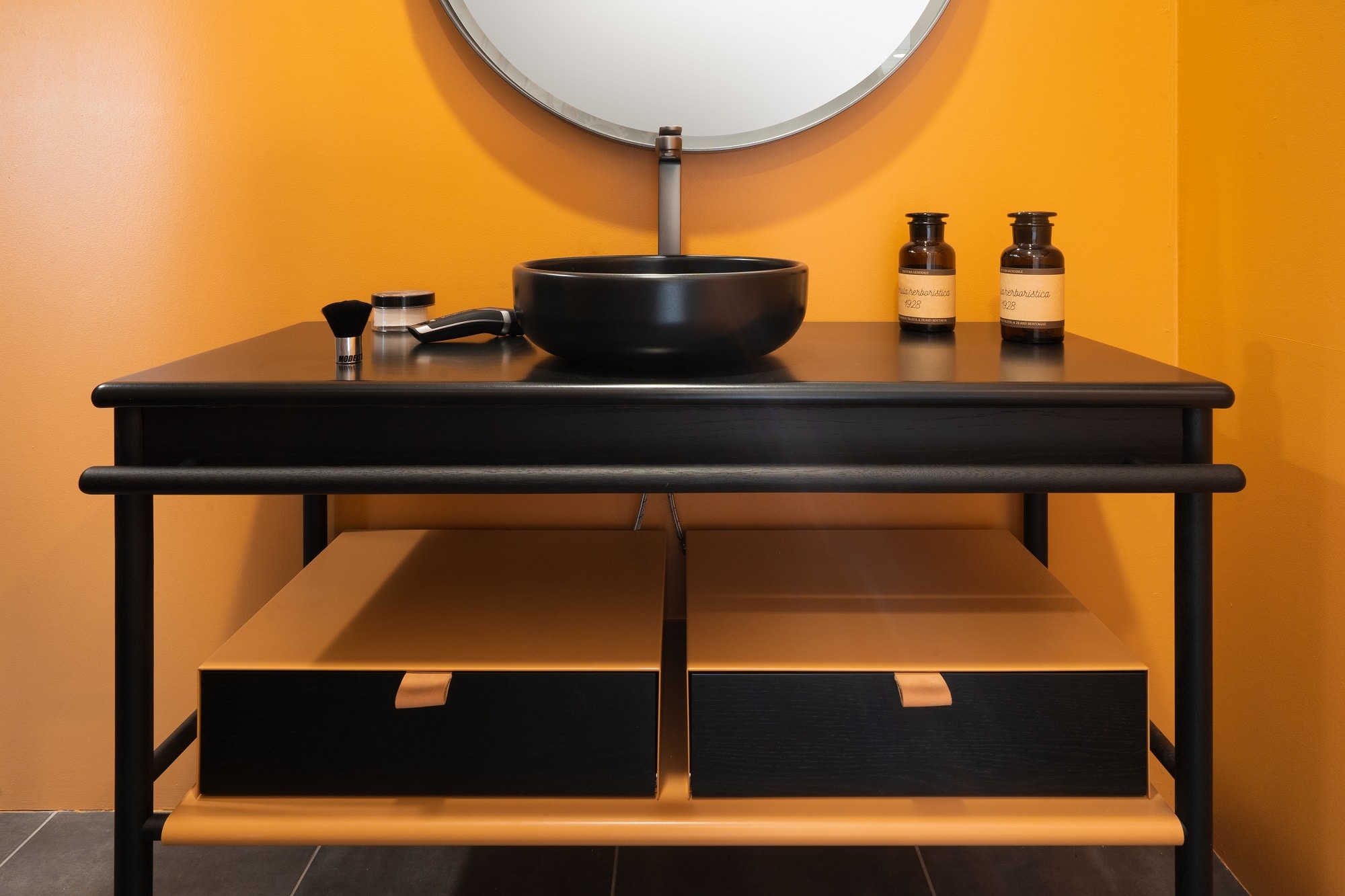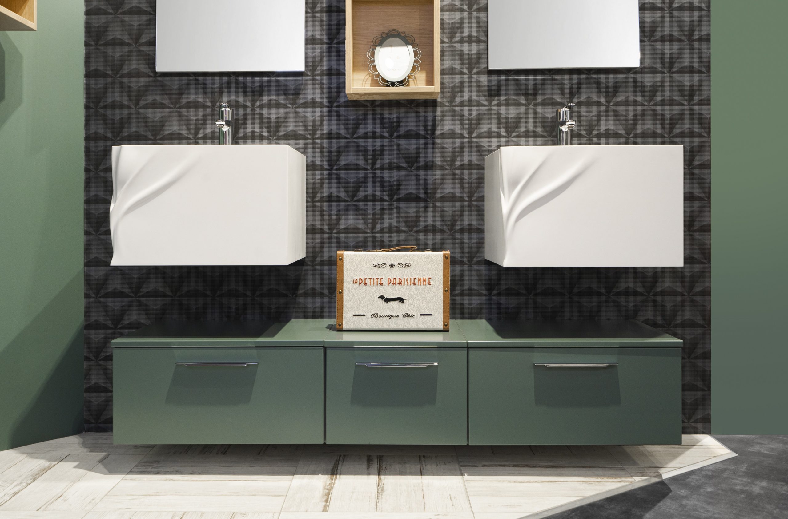 Des lignes sobres et élégantes, un revêtement en carrelage mural en relief noir et un bas de meuble salle de bain vert olive, l’ensemble peut surprendre mais il s’harmonise parfaitement ! Design contemporain, lignes authentiques et éléments faisant preuve de sobriété : voici la recette de cette composition salle de bain chic !