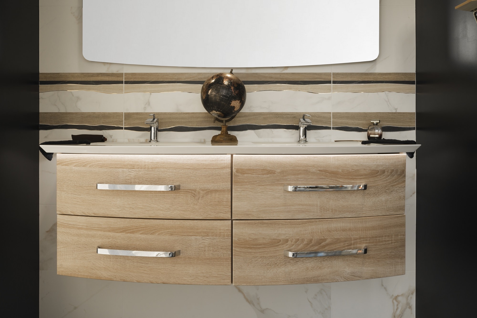 Paroxysme du chic et de l’élégance : associer le marbre avec des accessoires couleur or. Pour une composition plus sobre, tournez vous vers la robinetterie noire qui a récemment fait sa place dans nos salles de bains. Quoi que vous choisissiez, il faut retenir que le marbre reste un élément assez imposant, il convient donc soit de le limiter dans un espace défini (un seul mur par exemple) ou de l’accompagner d’un aménagement salle de bain très sobre pour éviter la surcharge ou disons le syndrome de Stendhal car vous avez toujours bon goût !