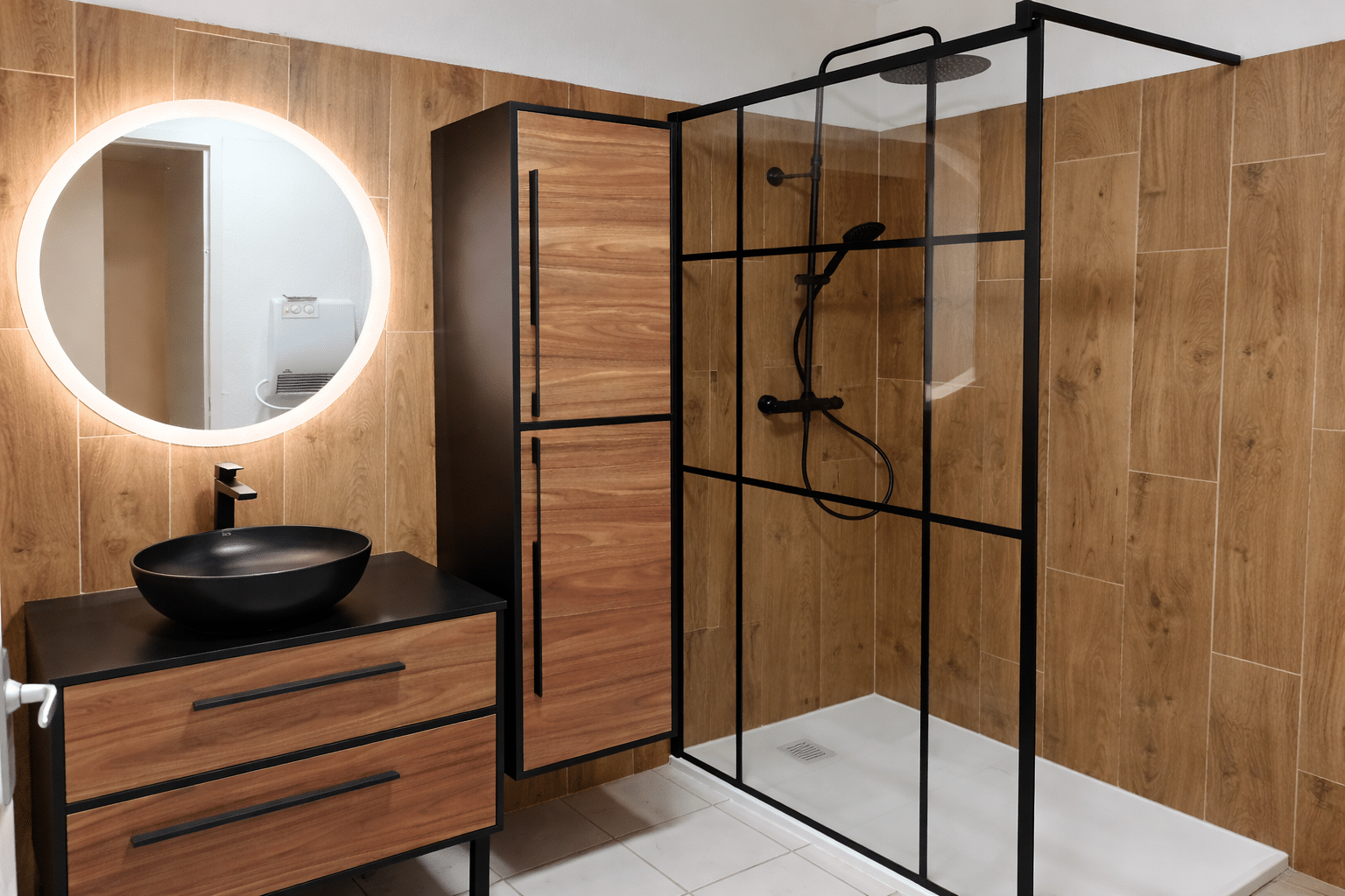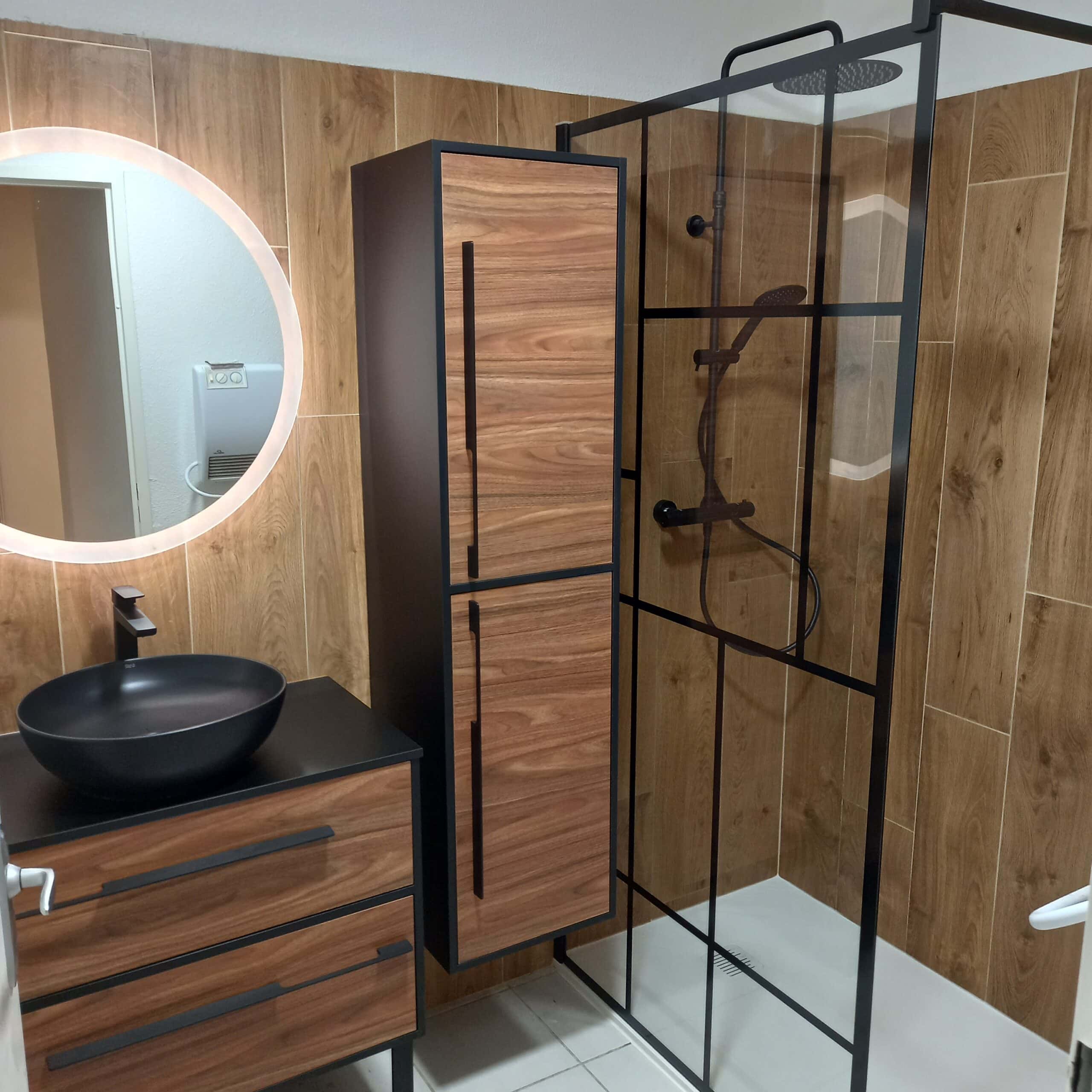 Cette salle d’eau a été pensée pour offrir un style affirmé et chaleureux. L’association du bois façon noyer et des lignes noires crée un contraste moderne, renforcé par la verrière esprit atelier qui structure l’espace. Le meuble vasque noir mat et sa vasque ronde apportent une touche design, tandis que la faïence effet bois unifie la pièce dans une ambiance naturelle et sophistiquée.