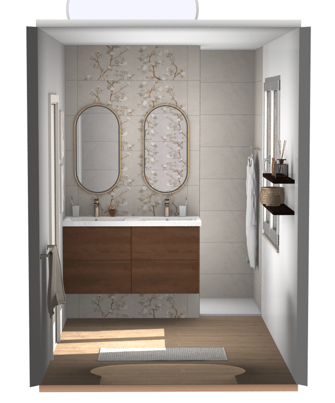 Ambiance douce et lumineuse : faïence à motif végétal, robinetterie laiton brossé, baignoire îlot et meuble double vasque en bois. Une salle de bain chaleureuse, élégante et très actuelle.
