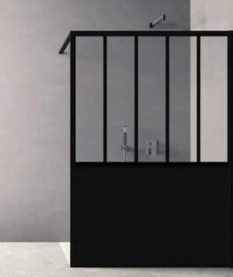 Cette salle de bain de 5 m² (Toulouse) a été entièrement repensée dans un style industriel pour gagner en luminosité et en espace. La verrière atelier en aluminium noir, le meuble salle de bain bois et le carrelage gris effet béton créent une ambiance urbaine affirmée, tandis que la faïence beige et la vasque blanche éclaircissent l’ensemble. Côté pratique, la rénovation remplace la baignoire par un grand espace douche à l’italienne, avec un receveur blanc texturé très résistant à la glissance, pour une salle de bain aussi design que fonctionnelle.