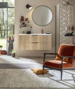 Un duo chaleureux et tendance : meuble salle de bain bois + détails noirs pour un look urbain