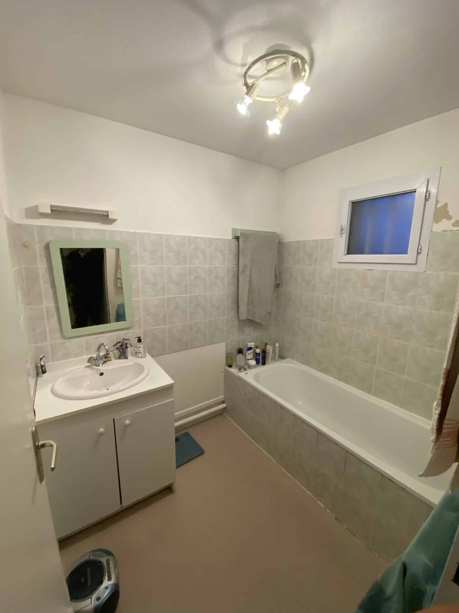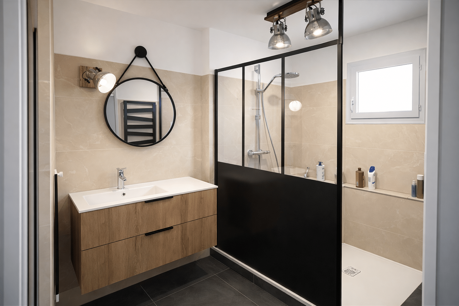 Cette salle de bain de 5 m² (Toulouse) a été entièrement repensée dans un style industriel pour gagner en luminosité et en espace. La verrière atelier en aluminium noir, le meuble salle de bain bois et le carrelage gris effet béton créent une ambiance urbaine affirmée, tandis que la faïence beige et la vasque blanche éclaircissent l’ensemble. Côté pratique, la rénovation remplace la baignoire par un grand espace douche à l’italienne, avec un receveur blanc texturé très résistant à la glissance, pour une salle de bain aussi design que fonctionnelle.
