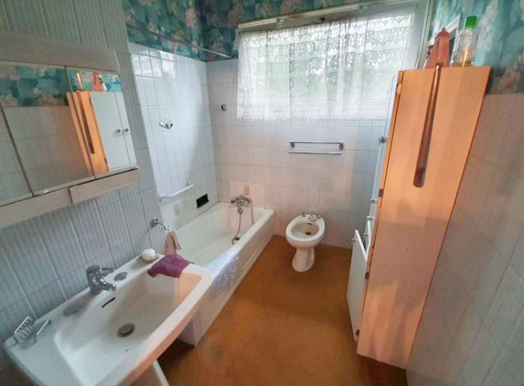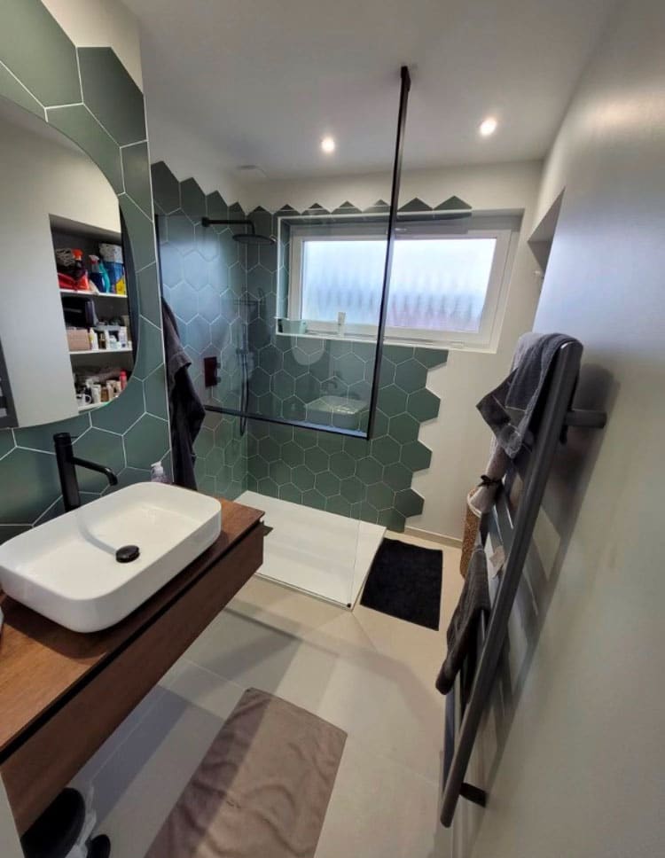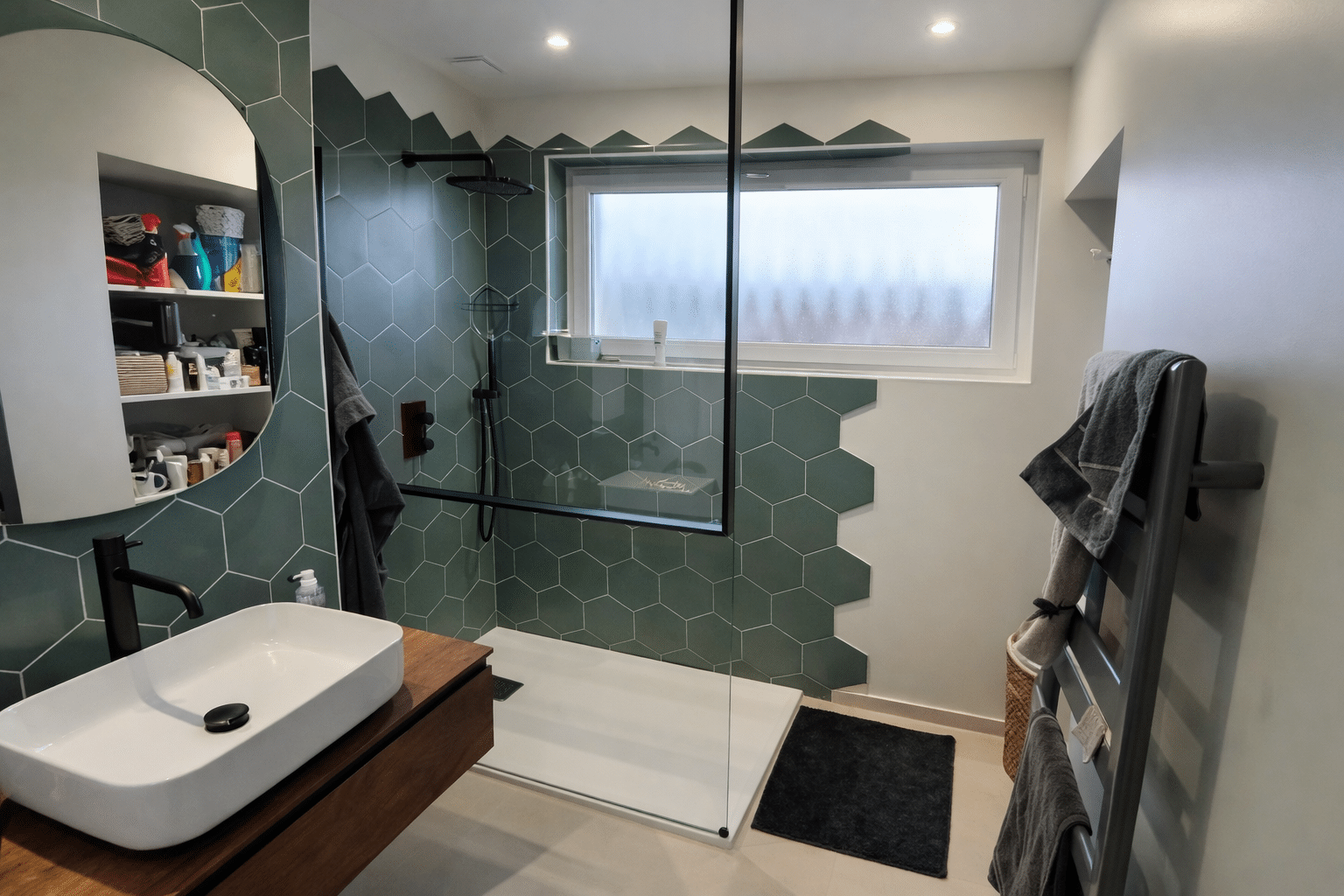 Cette salle de bain parentale a été entièrement rénovée pour un rendu plus moderne et chaleureux. La baignoire a été remplacée par une douche à l’italienne spacieuse, avec des rangements plus discrets et un choix de revêtements plus colorés.