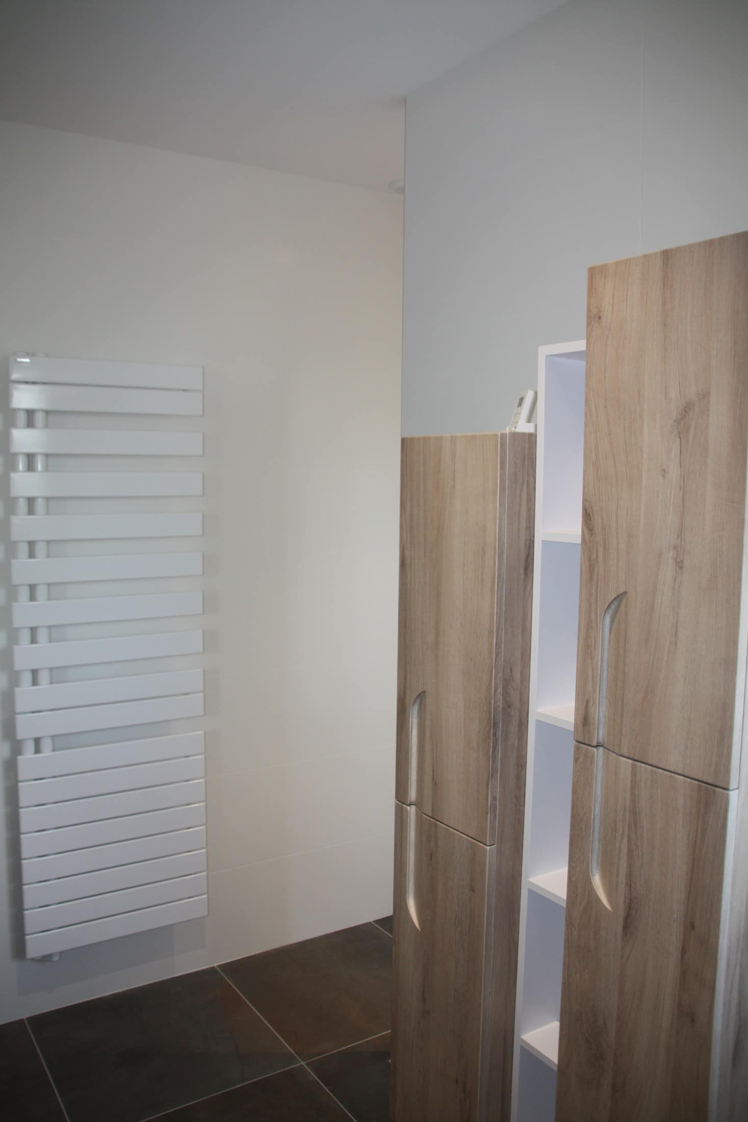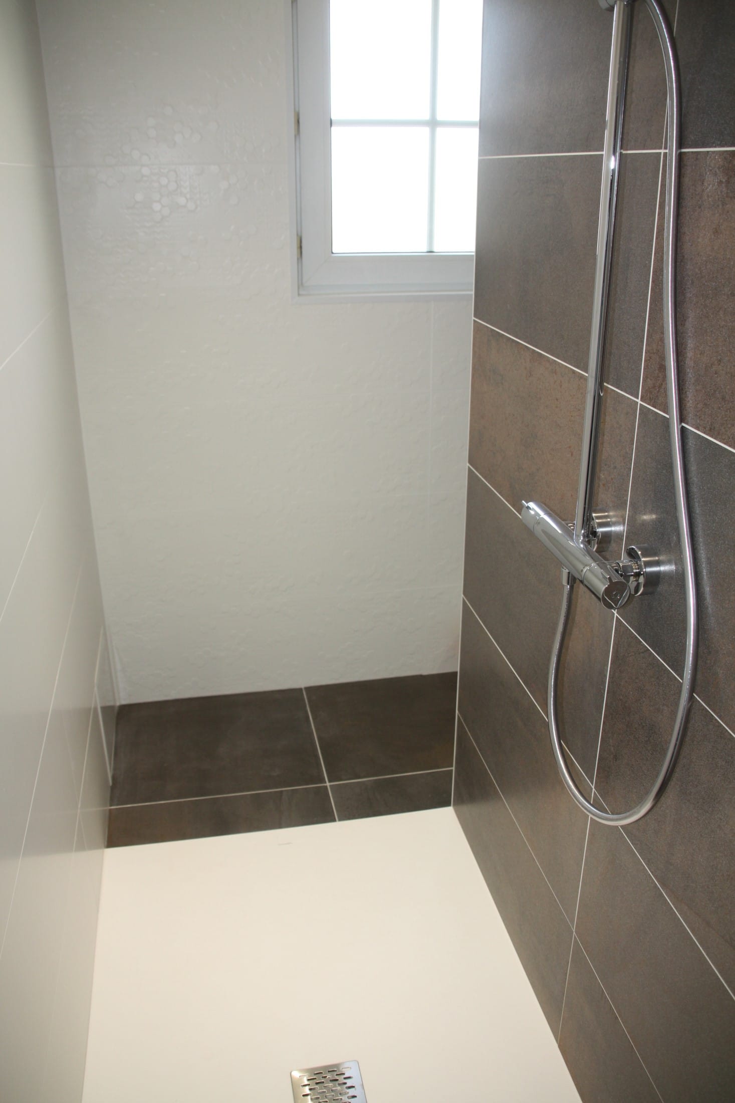 Côté douche, le receveur de douche Mcbath sur mesure (Coliséo) blanc extraplat, finition stone, s’intègre parfaitement. Le sèche-serviettes Acova (Fassane) apporte une touche design et se pilote à distance. Enfin, le carrelage salle de bain Grespania (Vulcano) habille le sol en métal oxydé effet ciment, avec un mur blanc assorti, tandis que le carrelage relief Nancy à motifs hexagonaux dynamise l’espace près de la fenêtre.