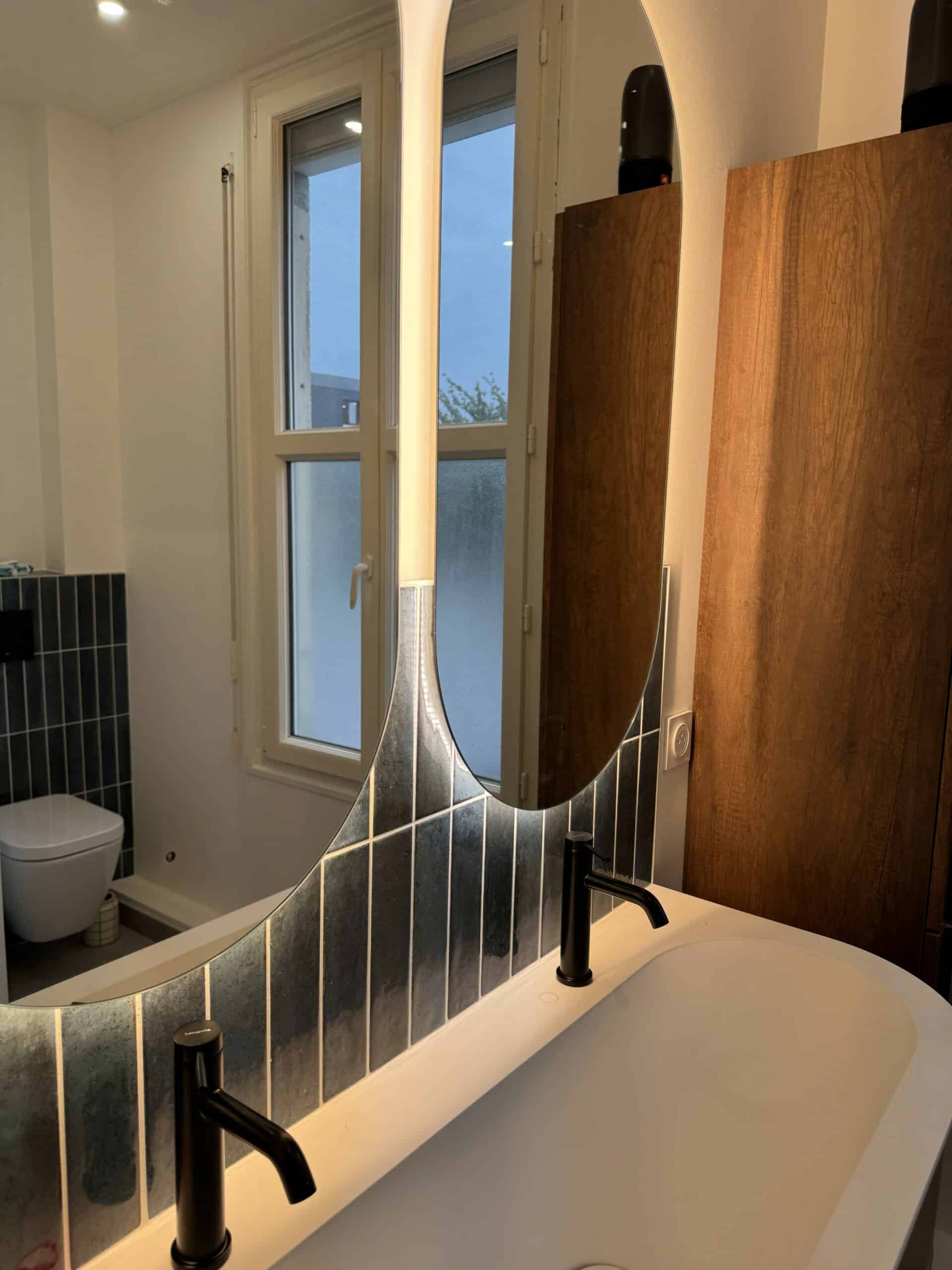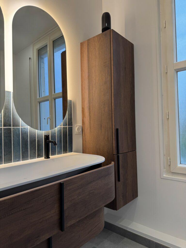 Un volume baigné de lumière, baignoire îlot, douche grand format, faïence bleu profond posée à la verticale et meuble-vasque suspendu aux angles arrondis. Entre bois chaleureux et carrelage minéral XXL, cette salle de bain compose une ambiance de suite d’hôtel, apaisante et contemporaine.