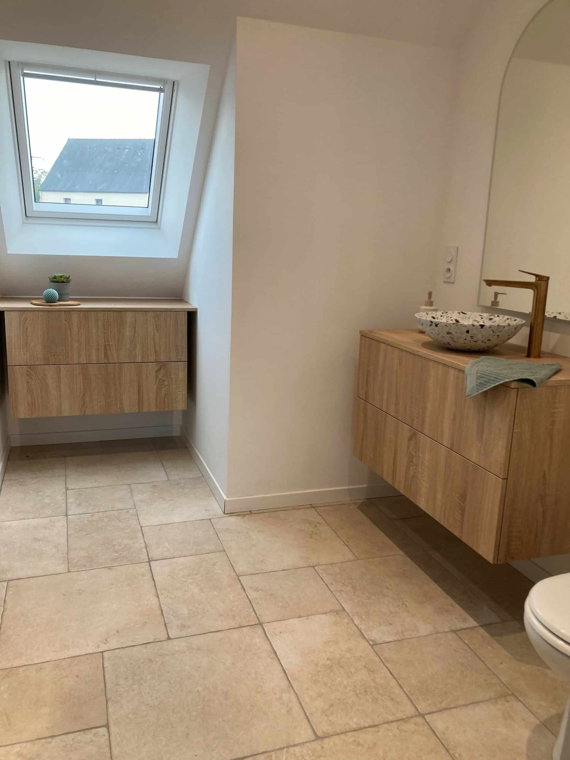 Côté meuble, le bois clair reste à l’honneur avec un plan suspendu qui accueille une vasque en terrazzo, clin d’œil au motif mural. Le miroir galet reflète la lumière de la fenêtre de toit.