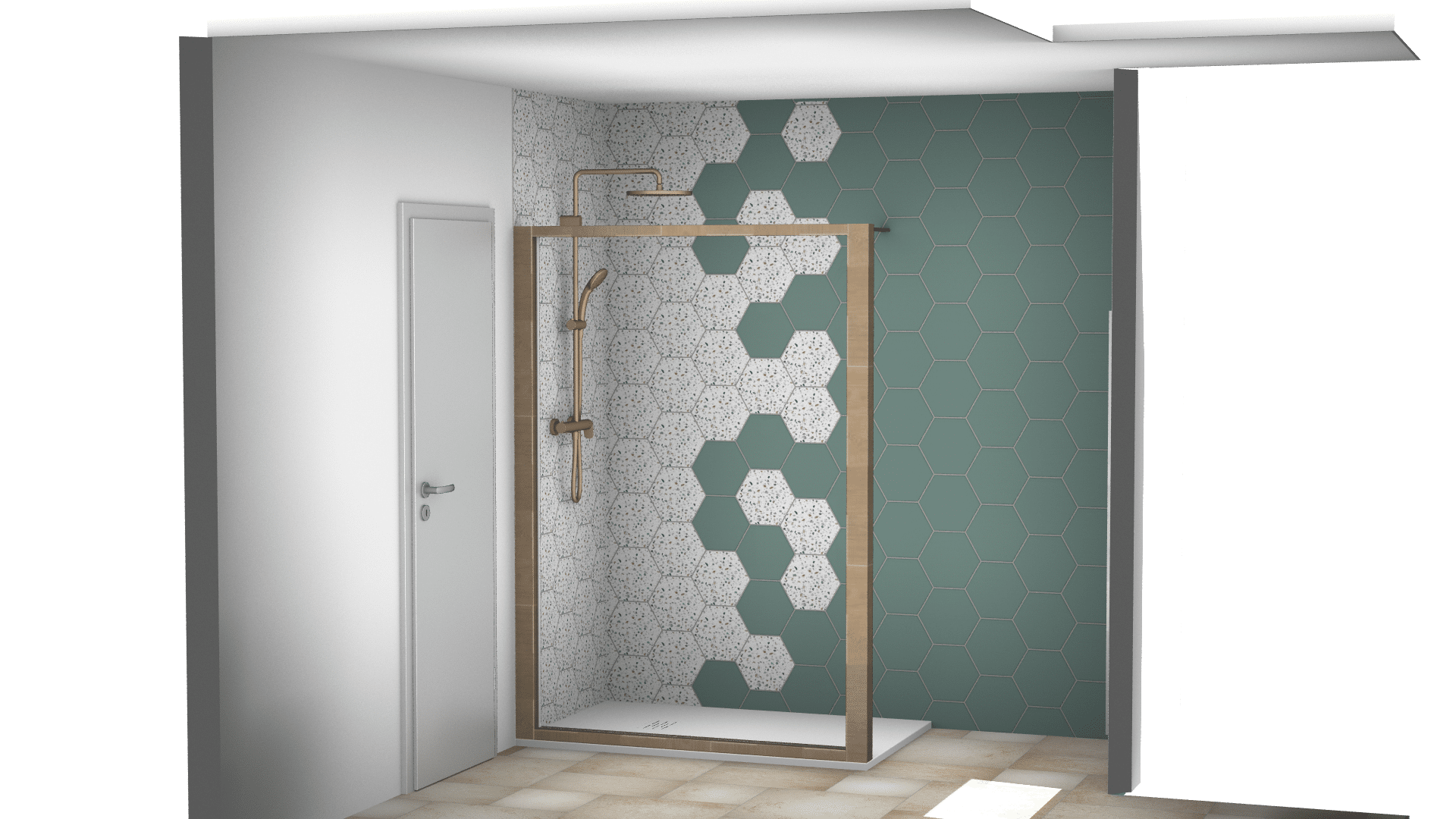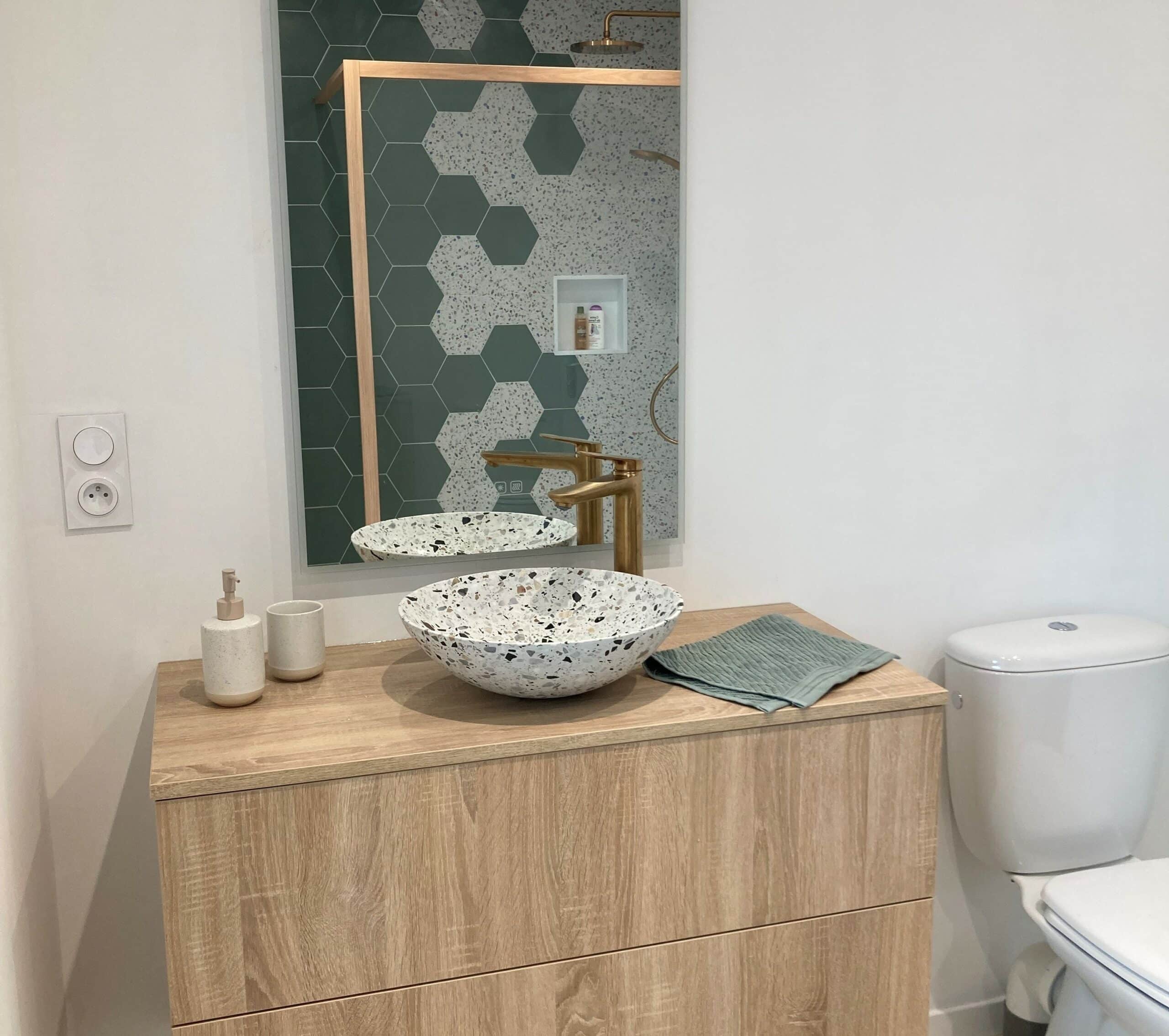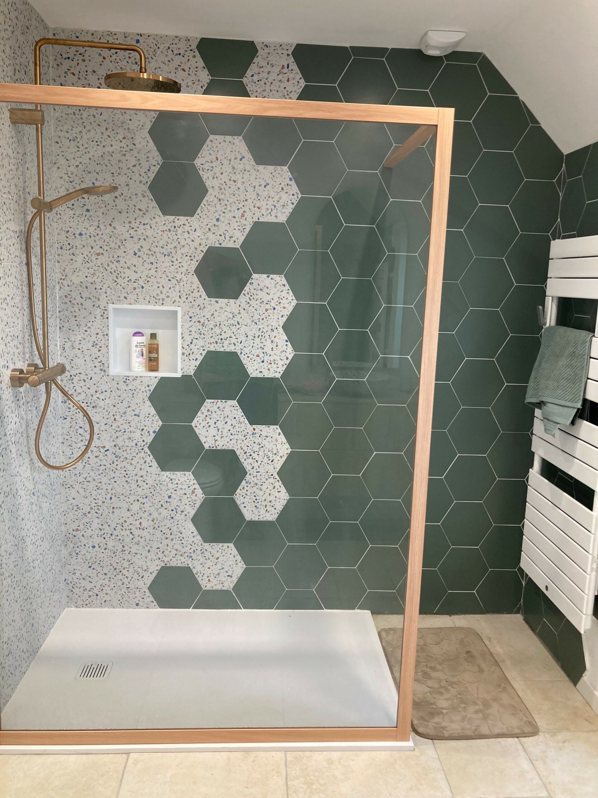 • Carrelage hexagonal vert & terrazzo pour une douche décorative