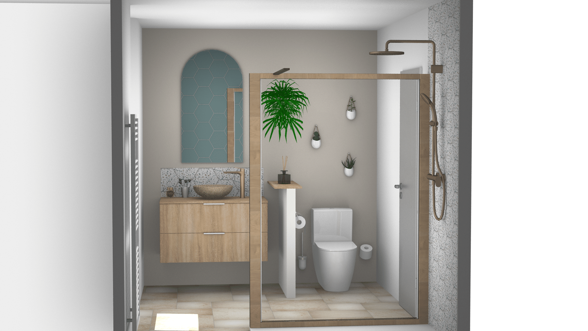 Carrelage hexagonal vert, paroi vitrée encadrée bois, meuble suspendu en bois clair et vasque terrazzo. Une salle de bain tendance et lumineuse, parfaitement intégrée sous les toits, conçue et validée en 3D en magasin.