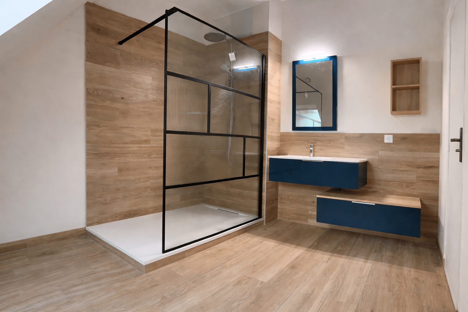 Carrelage imitation bois du sol aux murs, paroi de douche façon verrière en noir mat et meuble vasque suspendu bleu profond avec banc de rangement coordonné. Une salle de bain au style chaleureux et graphique, conçue et validée en 3D en magasin avec notre conseillère expo pour sécuriser les choix.