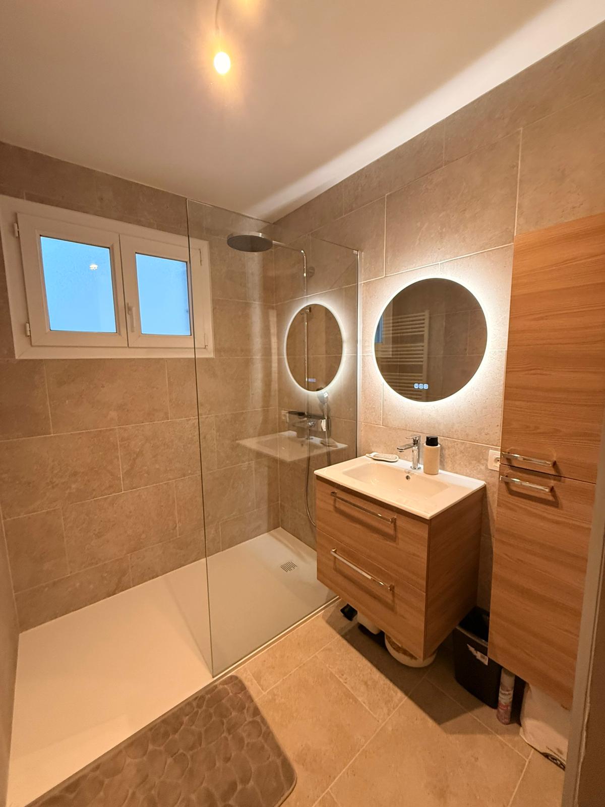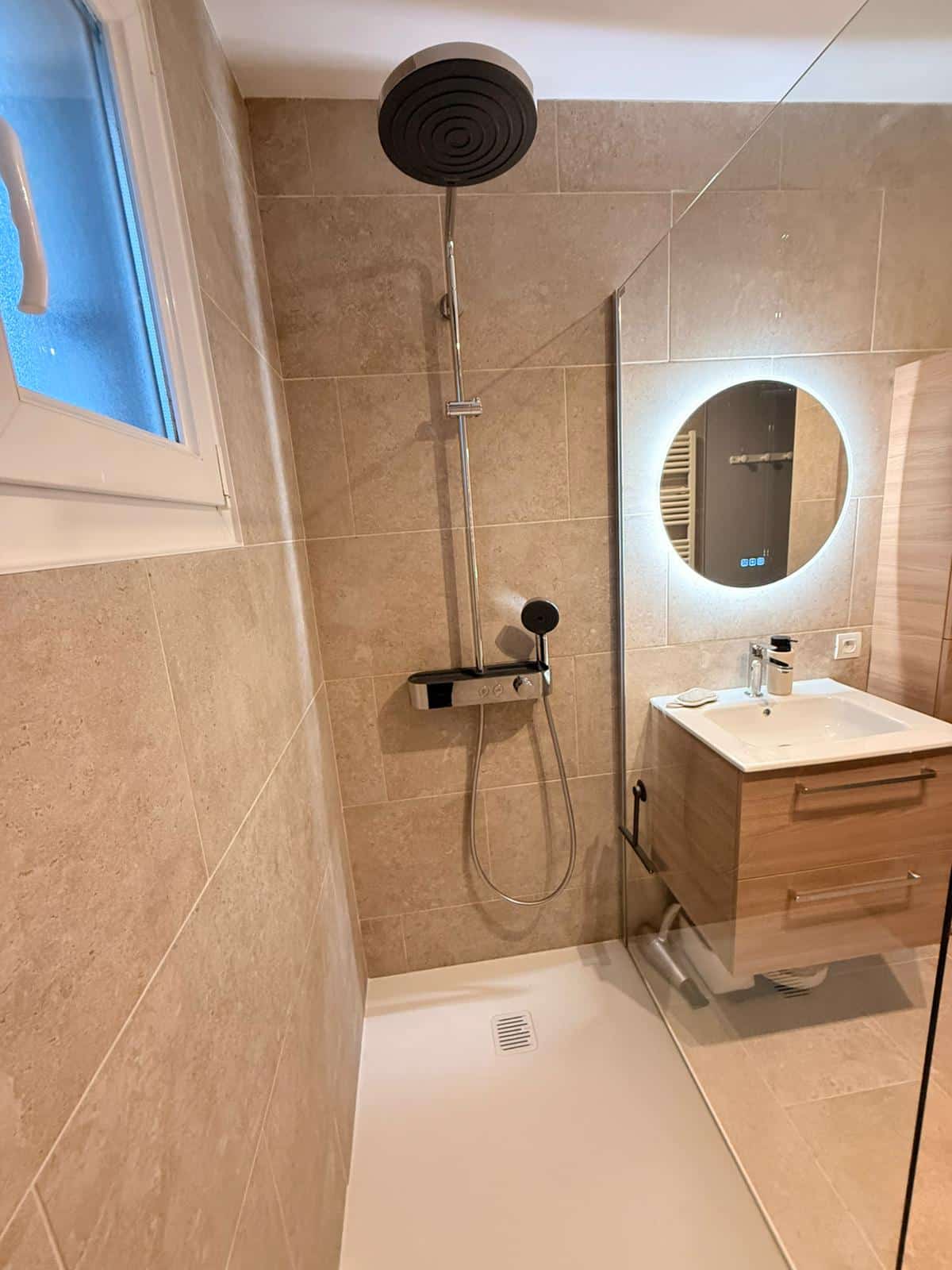 Dans une pièce en longueur, cette salle d’eau marie carrelage effet pierre sable, douche à l’italienne et meuble-vasque en bois clair. Miroir rond rétroéclairé, paroi en verre et rangements malins.