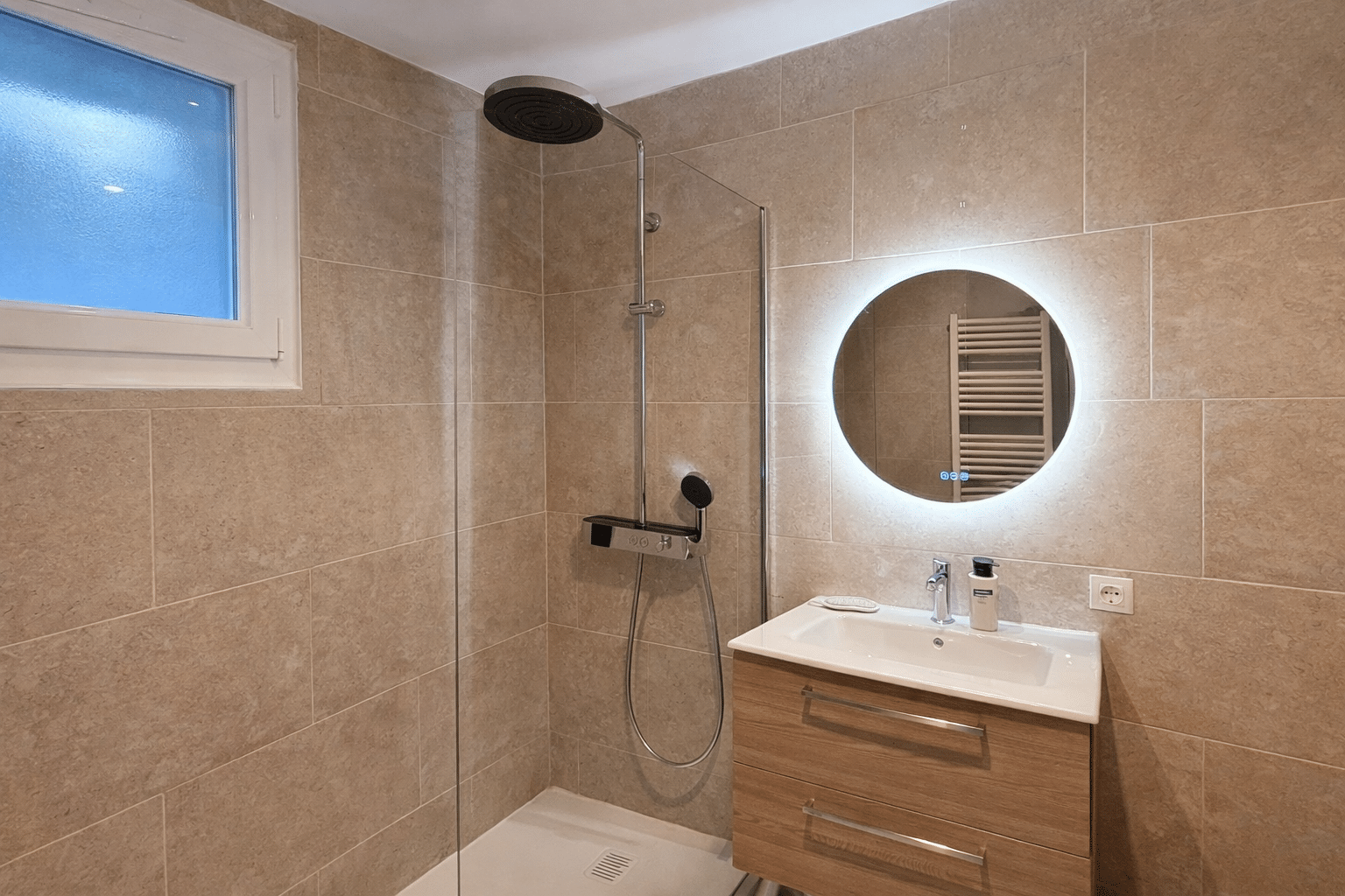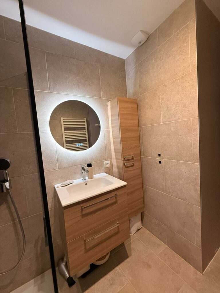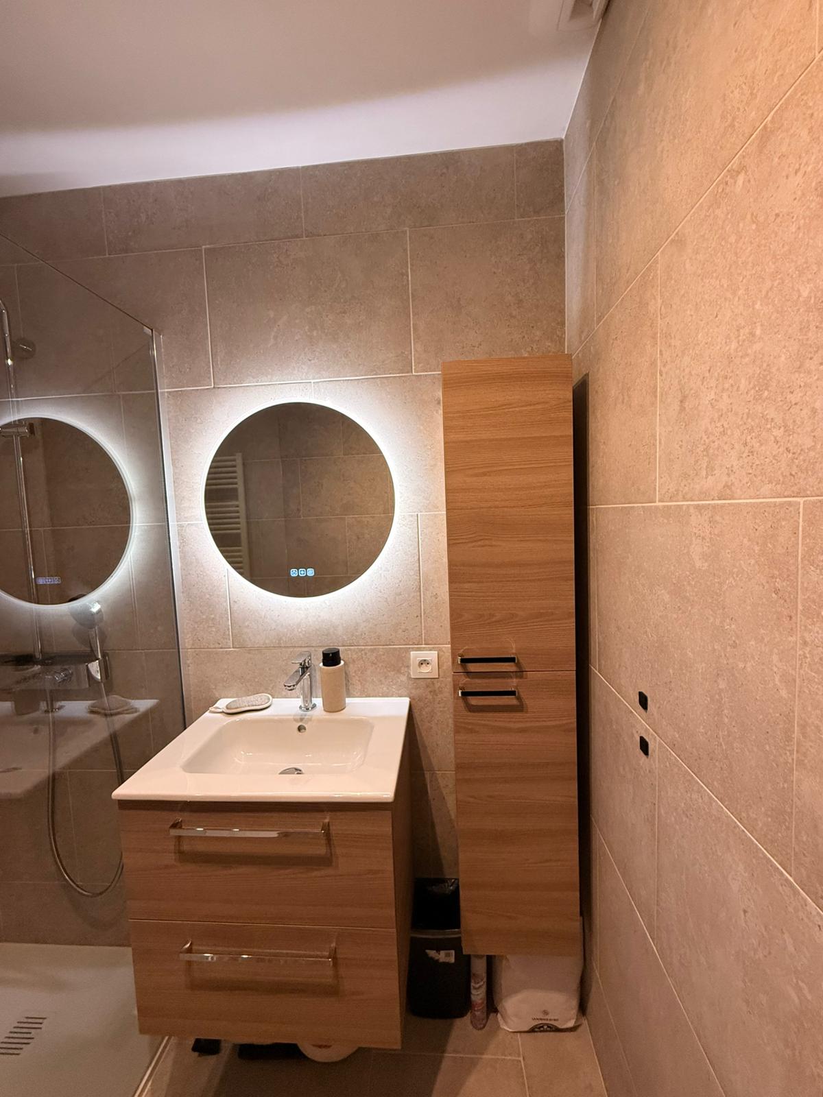 Le meuble vasque suspendu en bois clair et la colonne assortie offrent de beaux rangements tout en gardant la pièce légère. Le miroir rond LED apporte une lumière douce et une touche hôtel, complété par un sèche-serviettes blanc, discret et efficace.