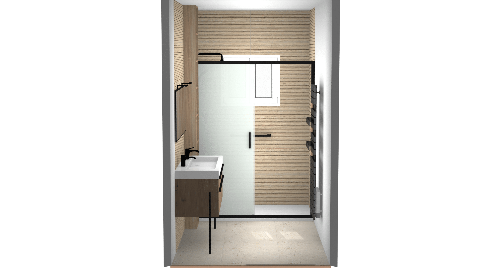 Cette salle d’eau étroite a été pensée comme un couloir de lumière. Les murs habillés d’une faïence à relief bois réchauffent l’ambiance et allongent visuellement la pièce. Au fond, la douche à l’italienne s’ouvre derrière une grande porte coulissante en verre dépoli : l’intimité est préservée tout en laissant passer la clarté de la fenêtre. Le cadre noir et la barre haute apportent la touche atelier.