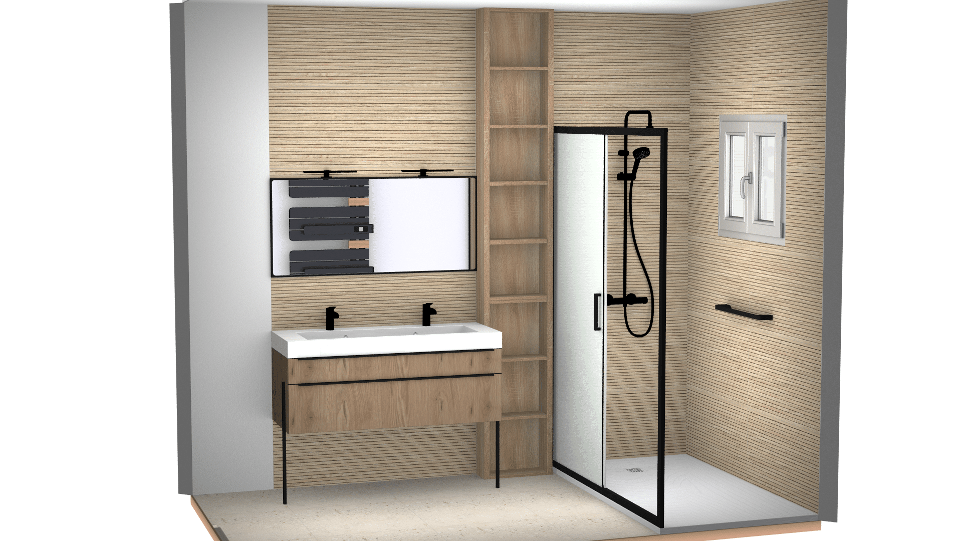 Le meuble surélevé couleur chêne, posé sur pieds filaires noirs, accueille une vasque longueur double robinet pour les routines à deux. Un miroir rectangulaire avec éclairage linéaire et une colonne ouverte offrent confort et rangements sans alourdir l’espace.