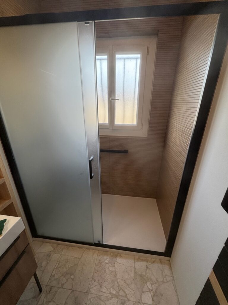 • Paroi coulissante en verre dépoli : luminosité + intimité