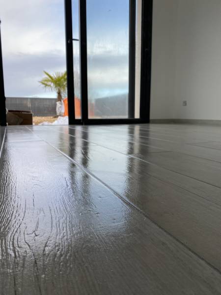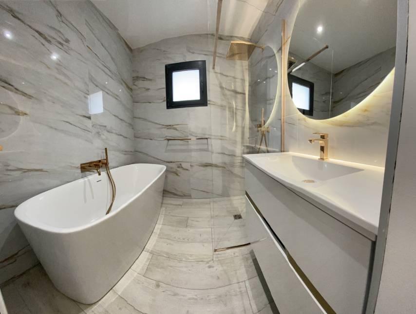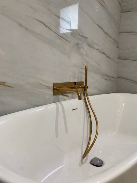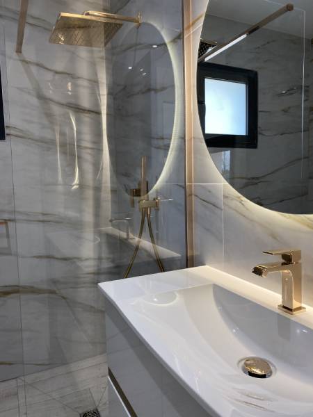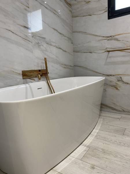 Un projet salle de bain qui trouve le parfait équilibre entre élégance et pureté. La tendance marbre s’invite ici avec de grandes dalles de carrelage Calacatta Gold (Roca), posées au mur et au sol, pour agrandir l’espace et créer une ambiance très chic.