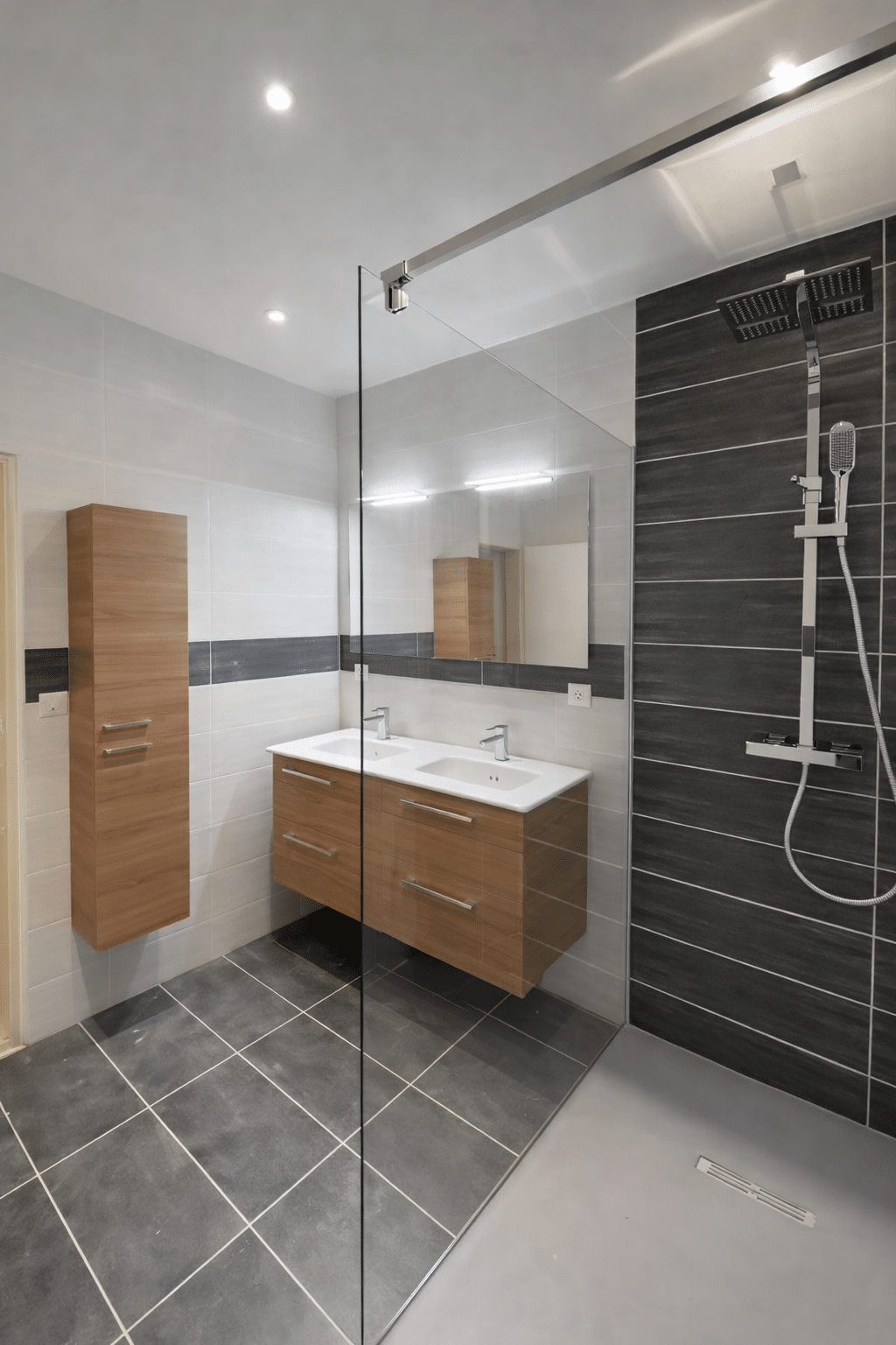 Côté douche, un receveur grand format Kinedo en gris clair, associé à une paroi transparente, préserve la luminosité et facilite l’accès. Les meubles de salle de bain en bois Anconetti s’intègrent naturellement, avec des poignées inox assorties à la robinetterie.