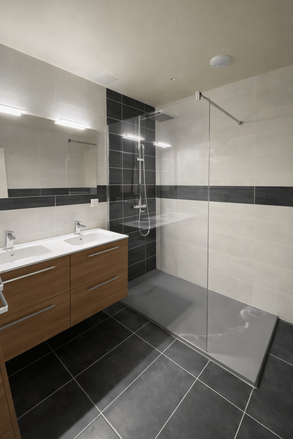 Une double vasque blanche Anconetti permet à plusieurs personnes d’utiliser l’espace en même temps. Au sol et sur les murs, le carrelage Ermes Ceramiche joue sur des tons gris et beige, soulignés par une frise grise qui fait le tour de la salle de bain et rappelle la teinte du sol.