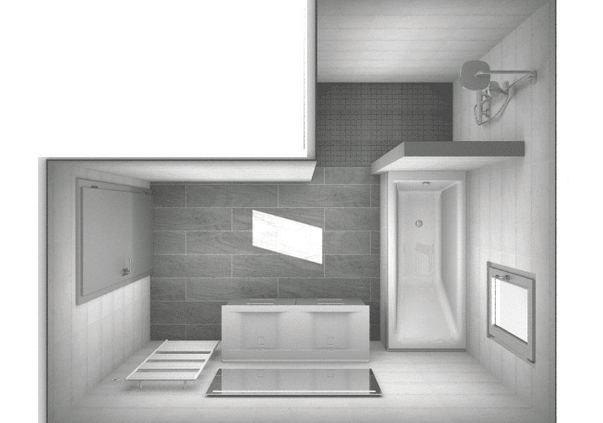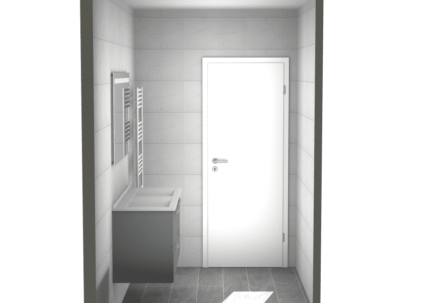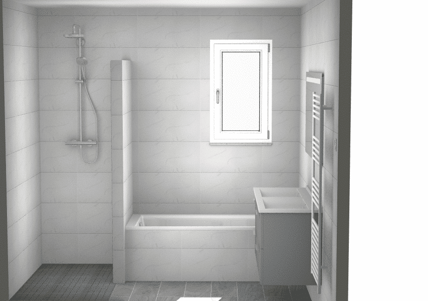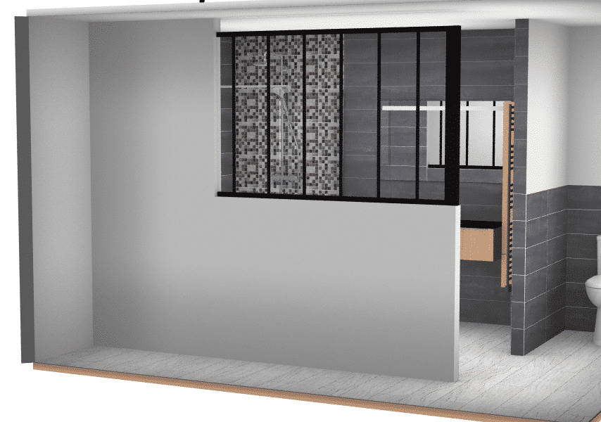 Deux salles de bains fonctionnelles, une au style industriel avec un WC et une moderne avec baignoire. Un projet réalisé dans un premier temps avec notre outil de modélisation 3D. Les lunettes 3D ont également été utilisées pour visualiser les deux salles de bains et entrer en immersion dans le projet. Une salle de bain avec verrière industrielle pour laisser le maximum de luminosité dans la pièce. Un ensemble meuble salle de bain en bois avec une vasque et des poignées noires pour rappeler la verrière.