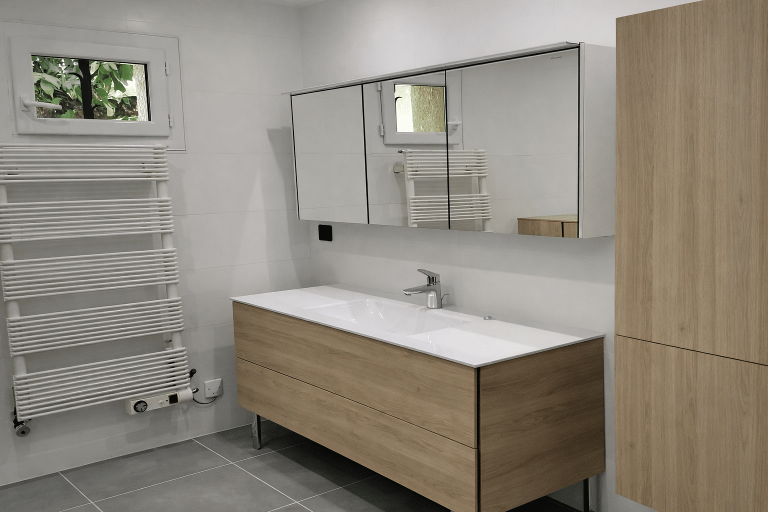 Cette salle de bain rénovée a troqué ses équipements vieillissants pour un aménagement moderne et spacieux. Elle intègre un meuble sous vasque, une colonne de rangement, une douche à l’italienne et un miroir avec rangement. Le grand receveur de douche (format XXL) renforce le confort et la sensation d’espace.