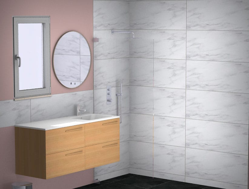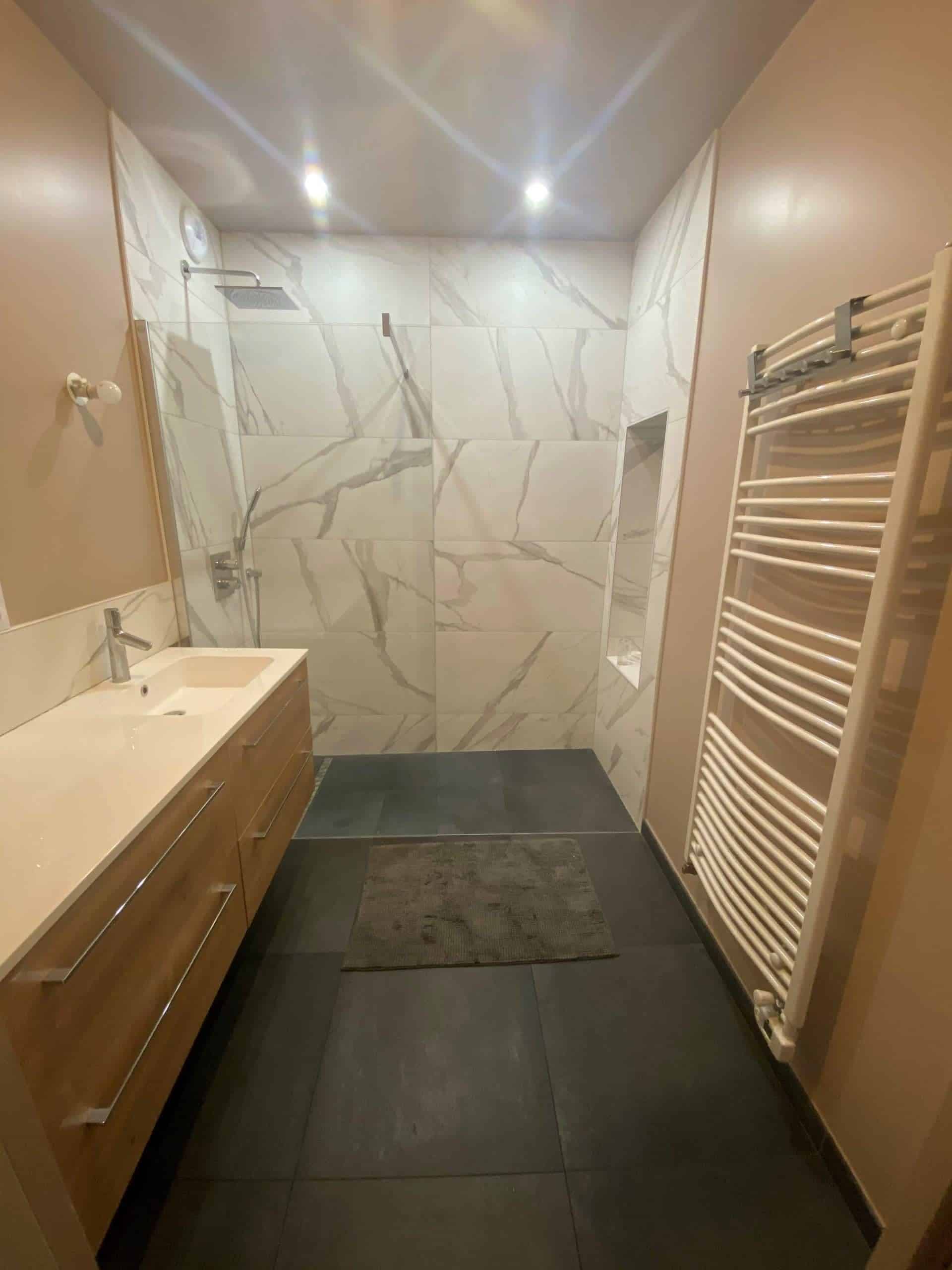 Des tons clairs aux murs et un sol anthracite effet béton : cette salle de bain mise sur un aménagement équilibré, à la fois lumineux et design. Dans l’espace douche, le carrelage salle de bain imitation marbre apporte une touche chic, tandis que les grands carreaux foncés ancrent l’ensemble.