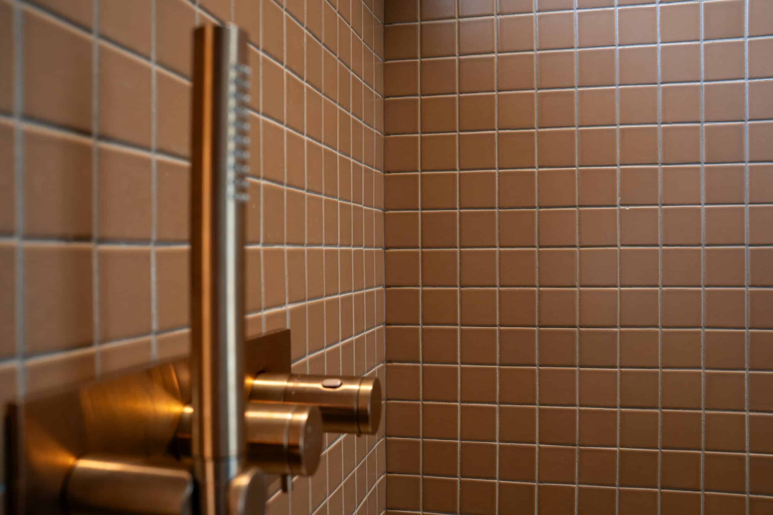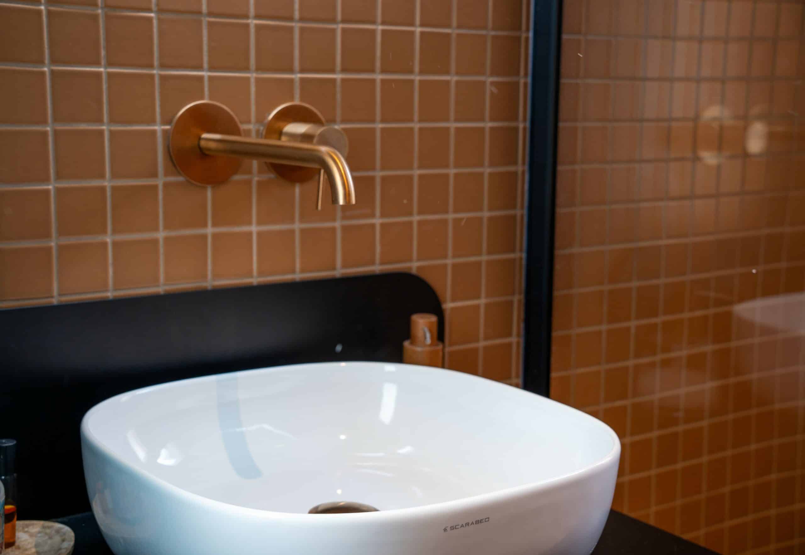 Cette salle de bain audacieuse joue sur les contrastes pour créer une ambiance résolument contemporaine. Le choix d’une faïence ocre orangé, entièrement posée en petites mosaïques, habille l’espace avec chaleur et singularité. Elle est mise en valeur par une robinetterie murale finition laiton brossé, qui apporte une touche d’élégance intemporelle.